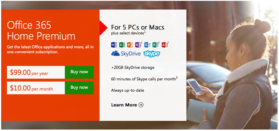 Office 365 Home Premium is a cloud service designed for busy households and people juggling ever-increasing work and family responsibilities. The new offering includes the latest and most complete set of Office applications; works across up to five devices, including Windows tablets, PCs and Macs; and comes with extra SkyDrive storage and Skype calling — all for US$99.99 for an annual subscription, the equivalent of US$8.34 per month.