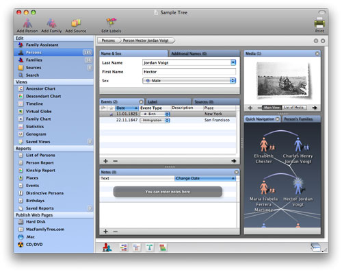 MacFamilyTree 5 has been completely redesigned and rewritten to leverage Apple's powerful programming and database technology Core Data to host a practically unlimited number of family members over time and space.