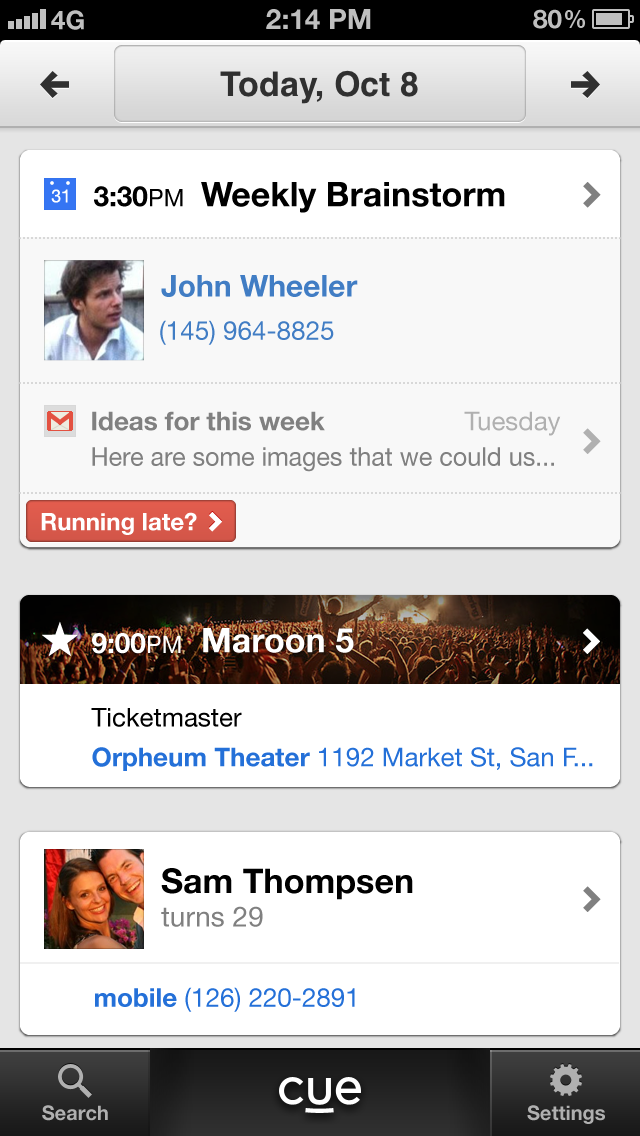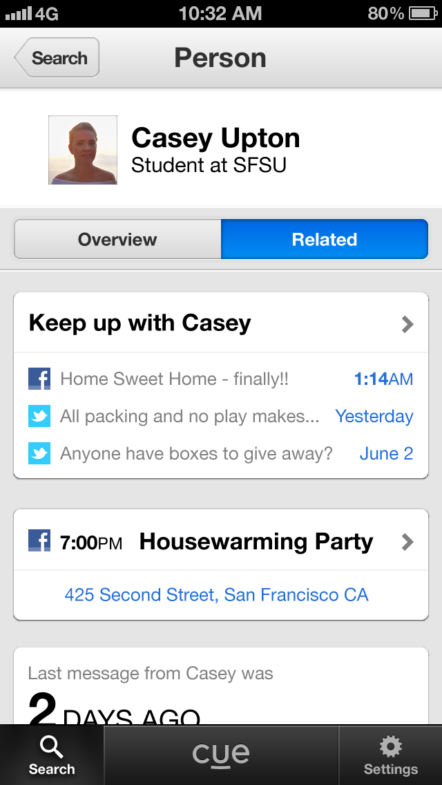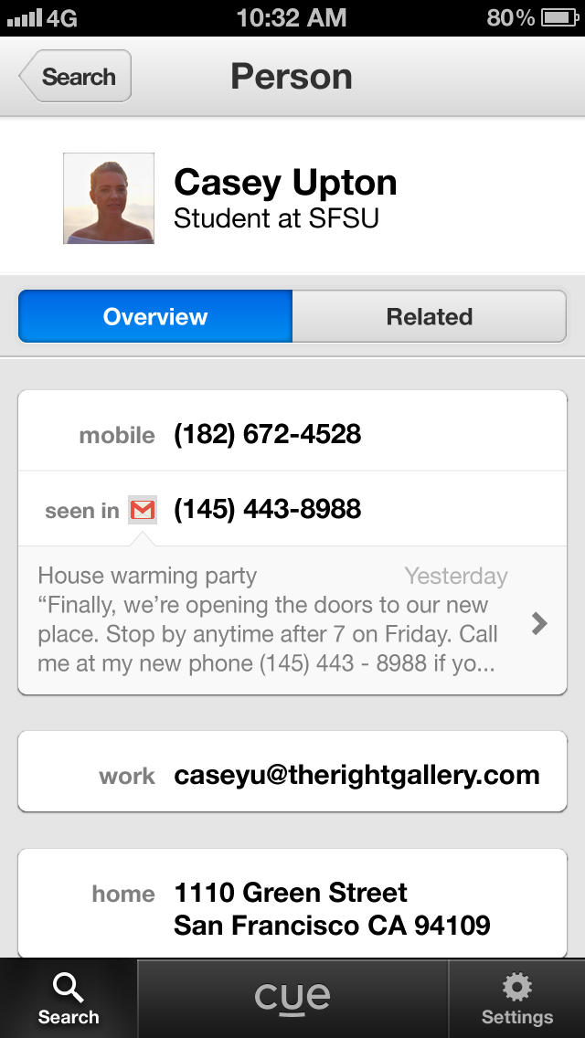 ----- Cue helps you get the most out of your day. With Cue, you can spend more time enjoying your life and less time shuffling through your accounts and apps for the things you need. Cue intelligently ties together and surfaces useful information at the right time across all your accounts. From email, contacts and calendars to Facebook posts, Dropbox files and LinkedIn -- Cue makes it easy to contact the people you care about, get to where you are going, and to know what’s next.