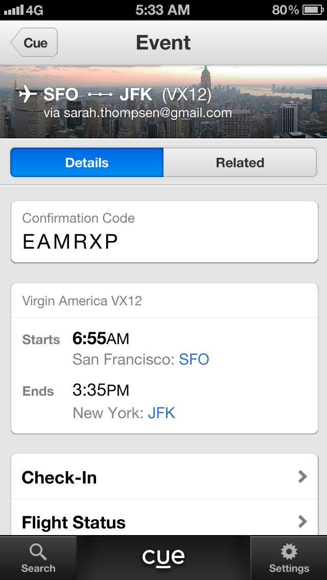 Cue Features: - Turn your email, contacts and calendar into an intelligent snapshot of your day. - Enhance your calendar by automatically connecting related emails, phone numbers, and addresses. - Change or cancel reservations, check into flights, track the arrival of packages, or text friends that you are running late. - See up-to-date contact info alongside recent communications and the contact’s latest posts on Facebook and Twitter. -----