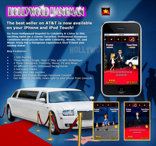 LimeLife has announced that Hollywood Hangman is now available on the Apple iTunes App Store for the iPhone and iPod touch. A best-selling game on mobile phones, this new version of Hollywood Hangman is one of the first iPhone games to offer the social and multiplayer features enabled by Facebook Connect and multiplayer WiFi.