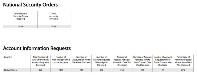 Apple is reporting the actual number of requests for information related to law enforcement investigations. Law enforcement requests most often relate to criminal investigations such as robbery, theft, murder, and kidnapping. In addition, Apple is re-reporting all the national security orders we have received, including orders received under FISA and National Security Letters (NSLs), to reflect the new guidelines that allow us to report these orders separate from law enforcement orders, in bands of 250. This data represents every U.S. national security order for data about our customers regardless of geography. We did not receive any orders for bulk data. The number of accounts involved in national security orders is infinitesimal relative to the hundreds of millions of accounts registered with Apple.