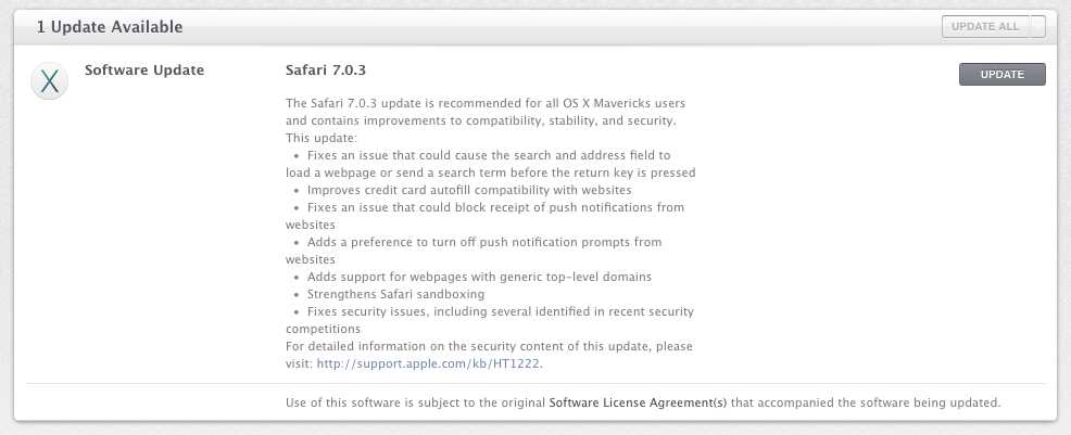 The Safari 7.0.3 update is recommended for all OS X Mavericks users and contains improvements to compatibility, stability, and security.