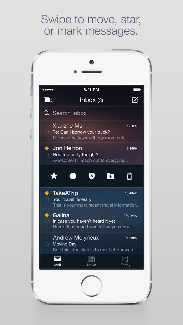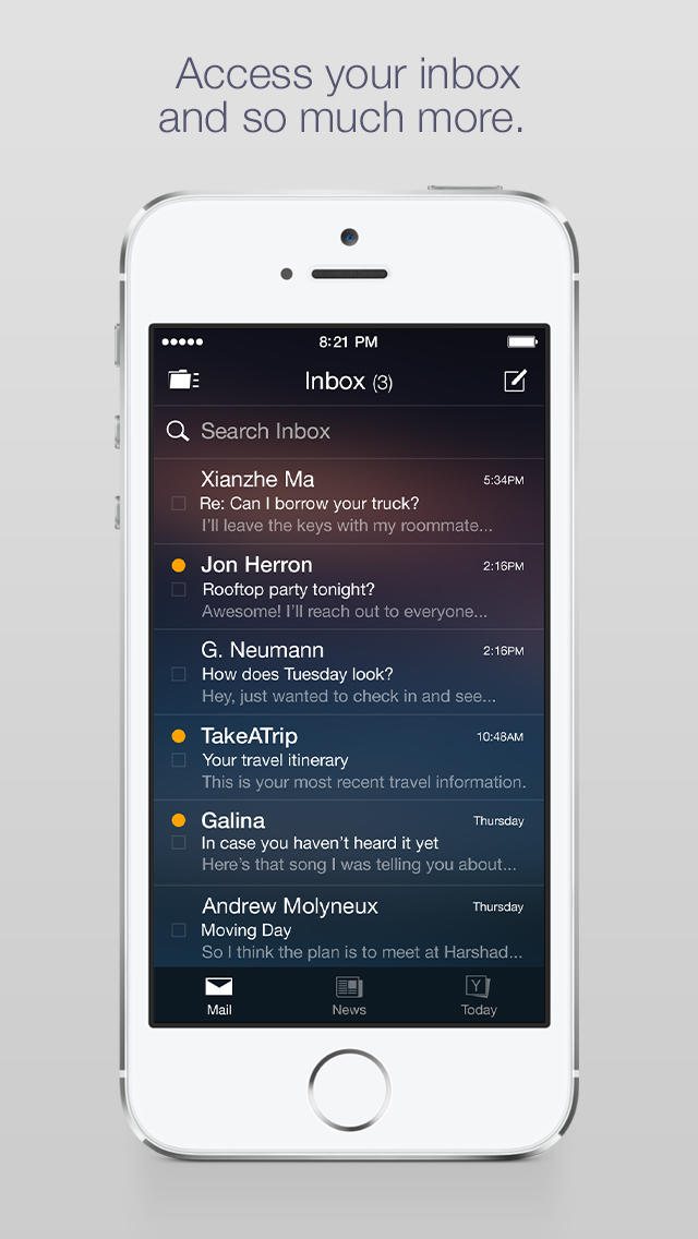 Features: - Switch between all of your Yahoo email accounts in one place. - Swipe left or right in your inbox to easily manage emails with quick actions. - Never miss a message with instant email alerts. - Stay on top of the stories you care about by tapping on News. (for iPhone iOS7+) - Tap on Today to search the web, and check info you need at a glance: today’s weather, sports scores, stocks, News Digest and more. (for iPhone iOS7+)