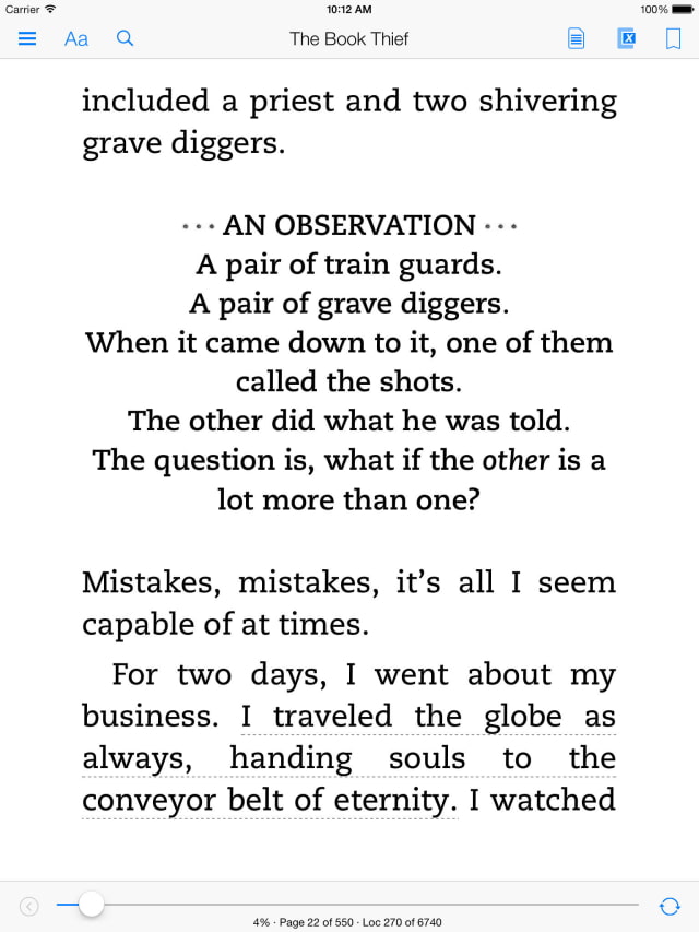 • Tap and hold text to quickly highlight important sections, easily edit or change highlight colors, and select long passages that span multiple pages.