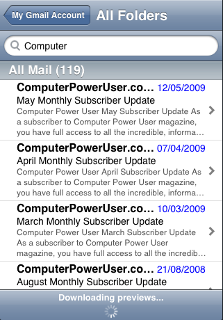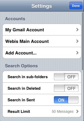 Using DeepFish an IMAP user can search the contents of their email across folders using a simple iPhone search interface. Setup multiple IMAP accounts and search for email individually, across folders, or through sub-folders.