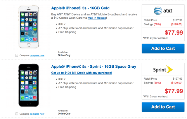 Costco is now selling the iPhone 5s at a 60% discount with a two year contract from AT&T, Sprint or Verizon. That brings the price down to $77.99 for the 16GB model.