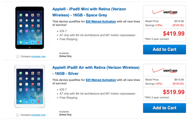 The company is also offering $100 off the iPad Air and iPad mini Retina with a Verizon contract.
