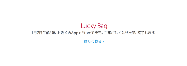 Lucky Bag Purchase Policy ● Apple Store Lucky Bags can only be purchased at Apple Retail Stores. ● We cannot change the price of Lucky Bag per a customer's request. ● The purchase of Lucky Bag is limited to one bag per person per day. ● Except when there is a confirmed defect in the hardware or accessory products in the Lucky Bag, Lucky Bag contents are not returnable, refundable or exchangeable. If there is a flaw in the hardware or accessory, please return the product with the original Lucky Bag receipt and original packaging within fourteen (14) calendar days from the date of purchase. Non-Apple brand products are sold by Apple "as is." Consult the manufacturer of such non-Apple brand for warranty terms and conditions. ● The Apple Store sells and ships products to end user customers only. You may not purchase for resale. Apple reserves the right to refuse or cancel your order if Apple suspects you are purchasing for resale. ● This promotion will be made invalid if any action is taken that is prohibited or restricted by law. ● Your purchase of Lucky Bags is subject to your agreeing to the above terms and conditions of sale. ● Apple reserves the right to change the terms and conditions and end the sale of Lucky Bags at anytime at its sole discretion and without notice. ● iTunes Cards are valid and usable only on Japan iTunes Store operated by iTunes K.K. Prior to using your iTunes card, you need an iTunes account and you need to accept the license and usage terms. You must be older than 13 years of age and reside in Japan. You need compatible software, hardware, and internet access (fees may apply). Non-refundable. Not for resale. Full terms apply, see www.apple.com/legal/itunes/jp/gifts.html. Content availability and pricing are subject to time of actual download.