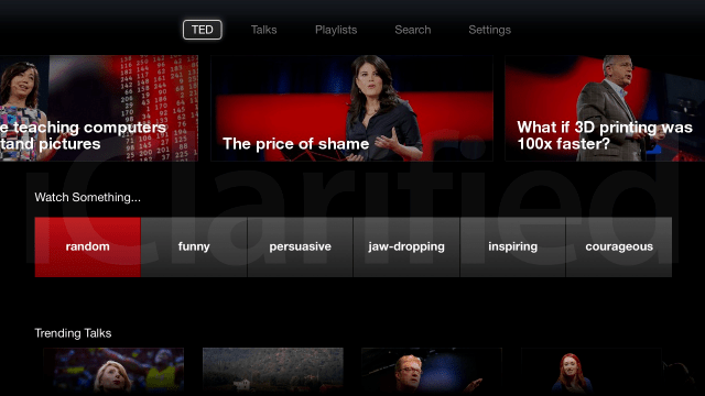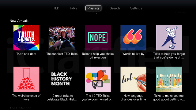 TED Talks TED is on Apple TV. In our beautifully designed new Apple TV channel, you can watch TED’s full library of talks (1900+ of them and counting) and our expanding collection of playlists (more than 200 of them, from “Architectural inspiration” to “Talks to watch when every conceivable bad thing has just happened to you”). When you finish a talk or playlist, another is instantly queued up for you, for proper binge-ability.