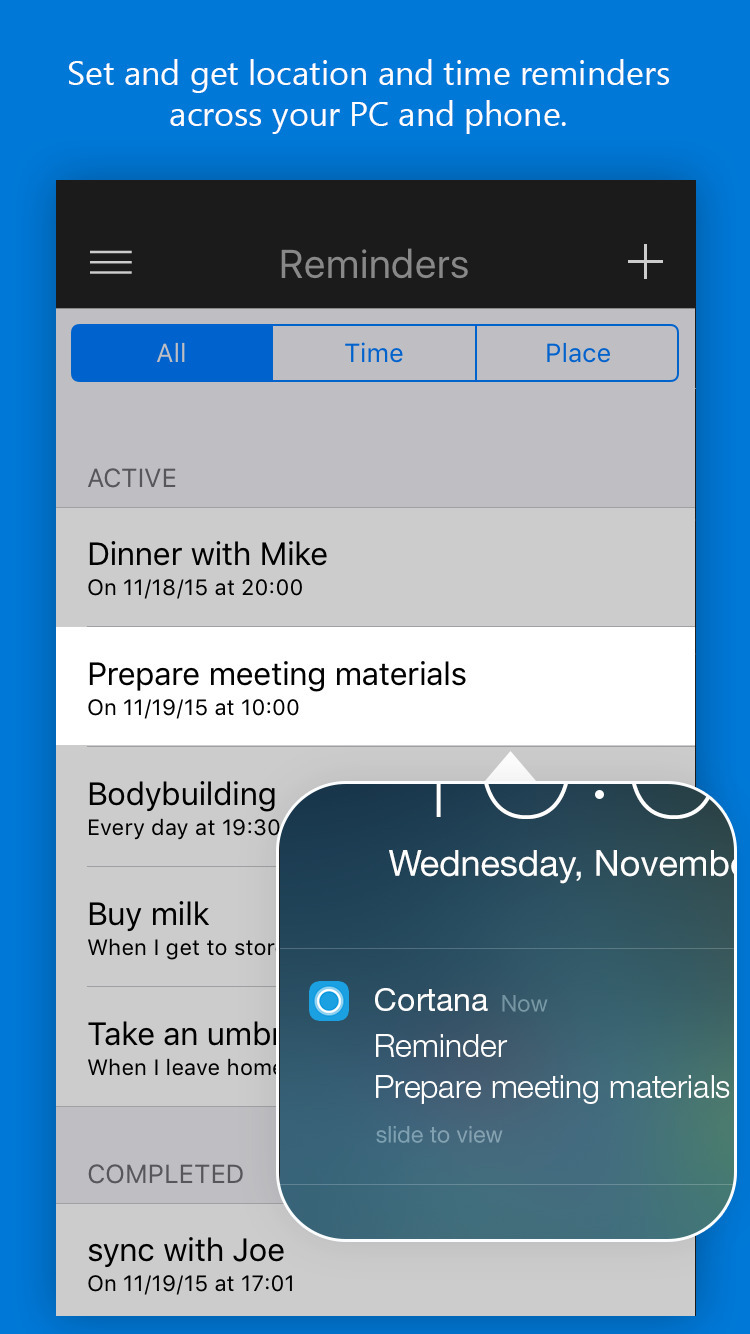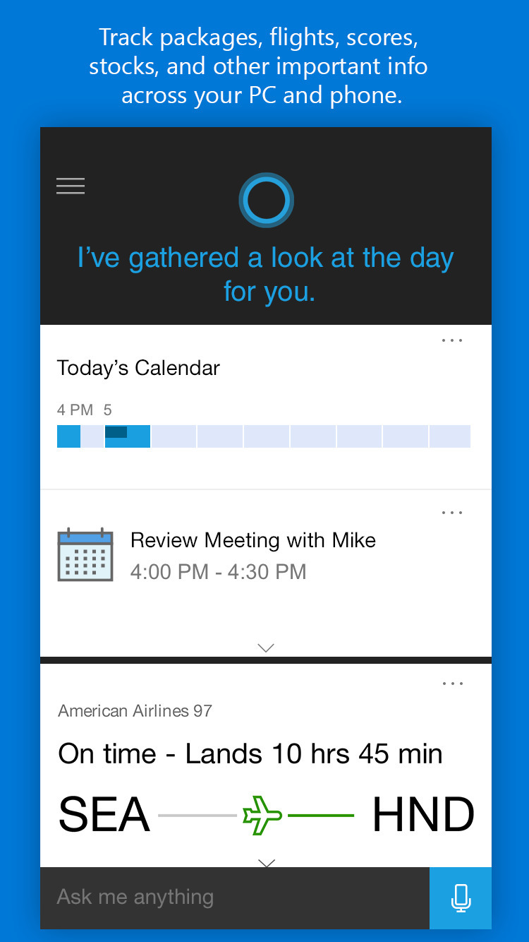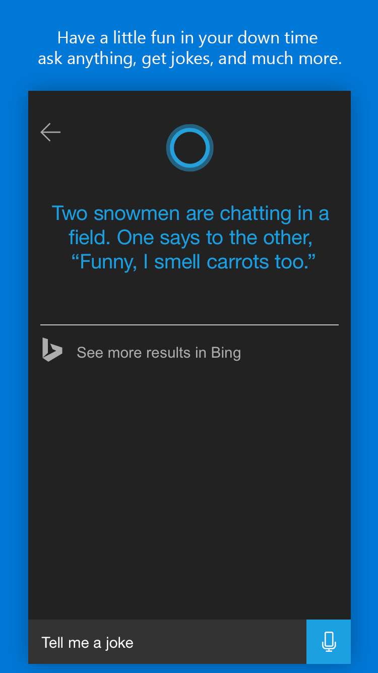 Cortana is your truly personal assistant—helping you get things done by letting your PC and iPhone work together. Your schedule, your interests, your people, your reminders—Cortana makes sure all that stuff is available wherever you need it. Set a reminder to pick up milk on the way home while you’re on your PC at work, and Cortana will give you the heads up on your iPhone when you’re on the road. Ask Cortana to make an appointment, send an email, open an app, or help you find what you’re looking for. And it’s not only about productivity, Cortana’s always up for a little chit chat. Ask Cortana whatever comes to mind, her answers might surprise you.
