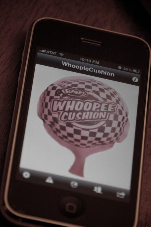 Whoopie Cushion 2.0. GrunewaldDev is following up it's hit with Whoopie 2, the same simple practical joke application but now utilizing core features of the iPhone 3.0 OS including both bluetooth and push notifications, allowing users to connect with friends for remote control of farts on other devices anywhere in the world.