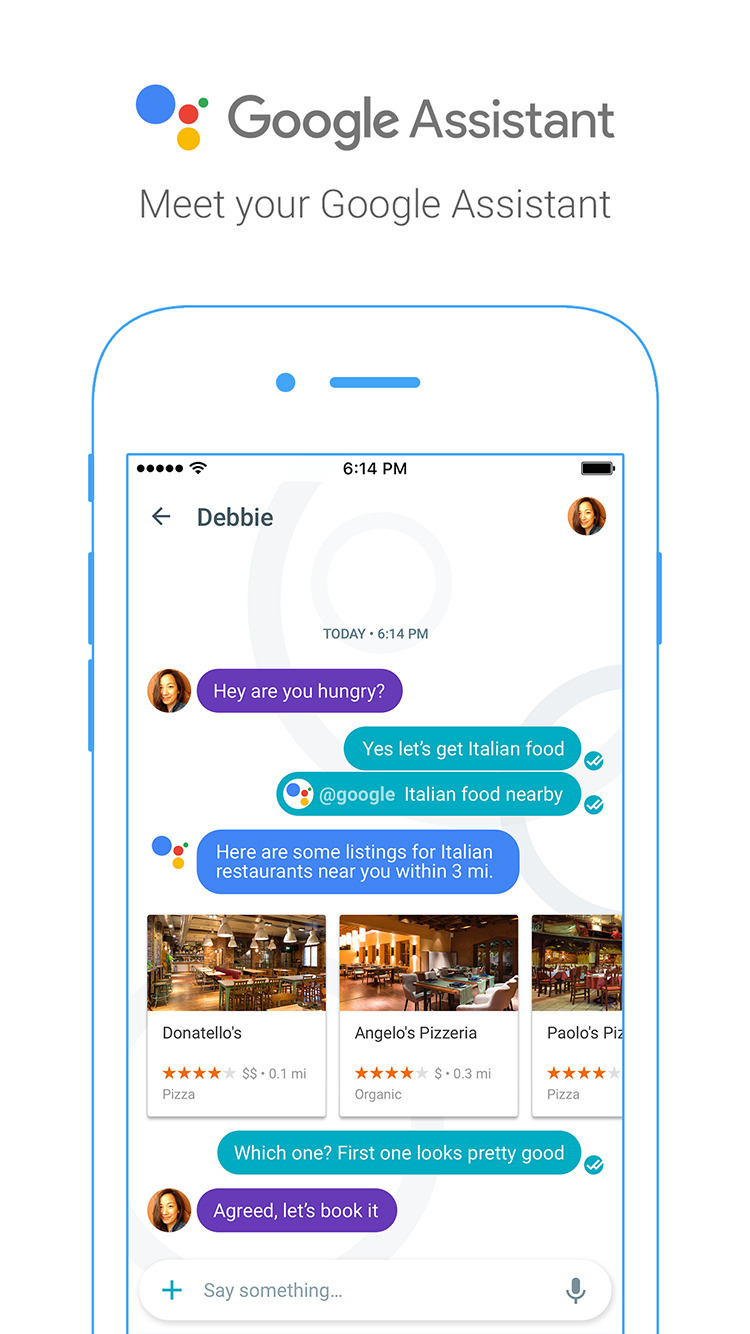 ● Meet your Google Assistant: Google Allo brings you the Google Assistant. Find restaurants nearby, share videos to watch, and get answers, right in your conversation with friends. Add @google to your group conversation or chat one-on-one with your Assistant. It’s your own personal Google, always ready to help.