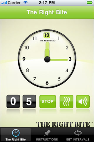 With The Right Bite, users apply this research to determine the optimal pace to eat less and be more satisfied and lose weight in the process. The Right Bite effortlessly cues users on an optimal eating pace for maximum weight loss impact. Certain users could actually lose up to 30+ pounds in less than 6 months, eating whatever they normally eat and desire. The application sports an easy-to-read visual display, with sound and/or vibration cues which serve to help the user stay on track. Among the application's notable features is it serves to turbo-charge the results of most, if not all other diets, such as Weight Watchers, Jenny Craig, Atkins, South Beach, and The Zone diets.