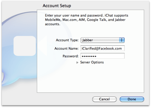 Facebook is preparing the launch of their XMPP connection interface which will allow you to use Facebook Chat through iChat and variety of other clients.
