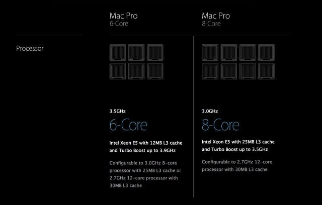 Previously, Apple offered a base quad core model with 12GB of RAM and dual AMD FirePro D300 GPUs for $2999 and a high-end 6-core model with 16GB of RAM and dual AMD FirePro D500 GPUs for $3999. That 6-core model is now the base model Mac Pro with a new price of $2999. The high-end spot has been filled by a 8-core model with 16GB of RAM and dual AMD FirePro D700 GPUs for $3999.