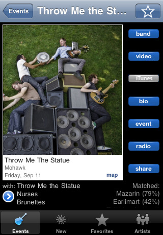 Beyond simply alerting a music lover to live shows by their favorite bands, BandMate analyzes the music they already listen to and discovers new bands that the music fan would want to check out. It searches through event listings in the city of the user's choice to create a personalized calendar of only the shows that they want to see. Each event even includes a probability score of how strong the recommendation is. BandMate also provides all the tools music fans need to find out more about artists, including links to schedules, videos, bios, music, along with easy ways to share any info with their friends via e-mail and Facebook.