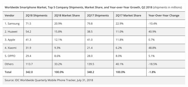 Huawei has surpassed Apple to become the world's second largest smartphone manufacturer, reports IDC. According to their Worldwide Quarterly Mobile Phone Tracker, 342 million smartphones were shipped in the second quarter of 2018, a 1.8% decline year over year.