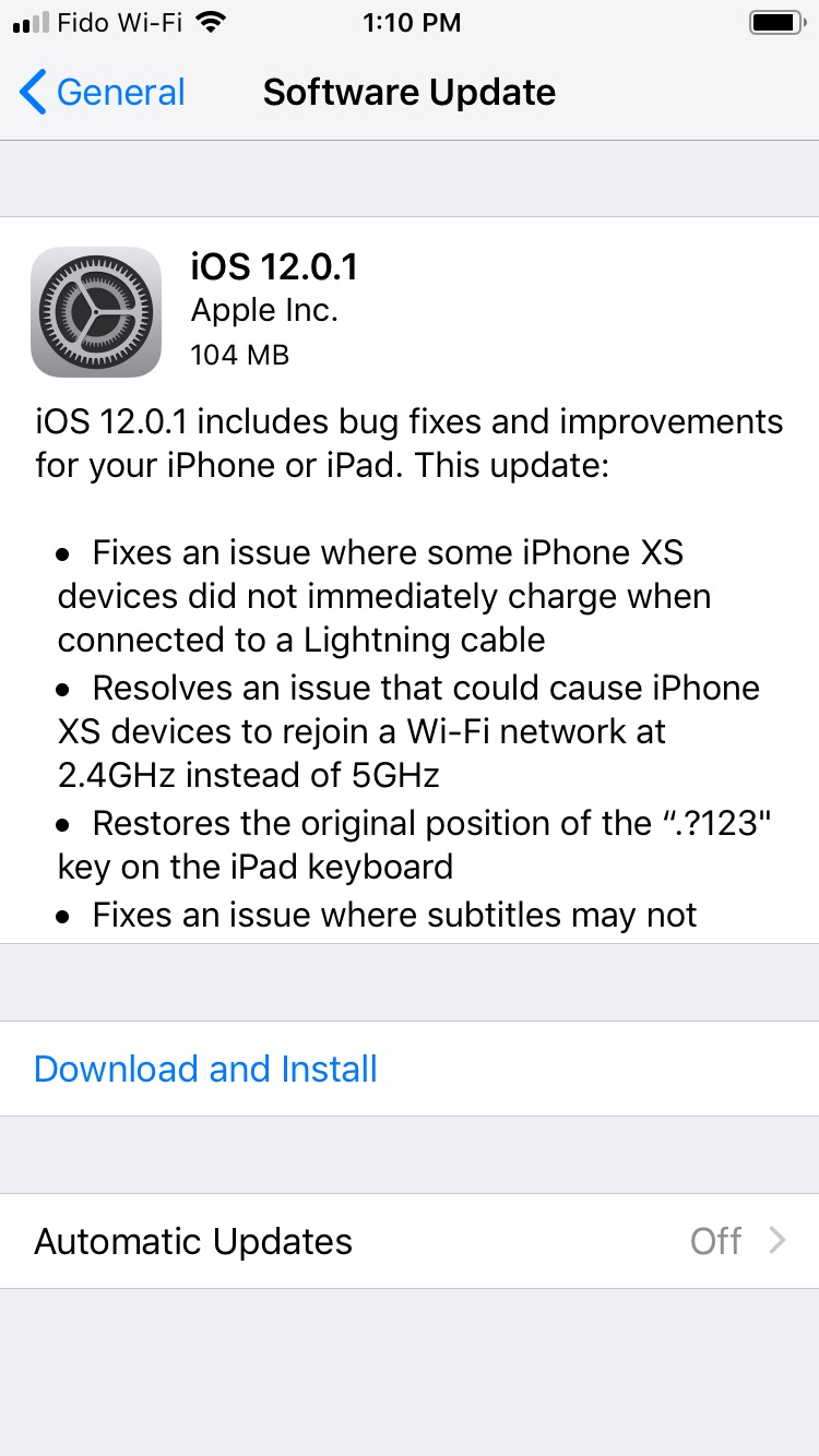 This update: ● Fixes an issue where some iPhone XS devices did not immediately charge when connected to a Lightning cable ● Resolves an issue that could cause iPhone XS devices to rejoin a Wi-Fi network at 2.4GHz instead of 5GHz ● Restores the original position of the “.?123" key on the iPad keyboard ● Fixes an issue where subtitles may not appear in some video apps ● Addresses an issue where Bluetooth could become unavailable