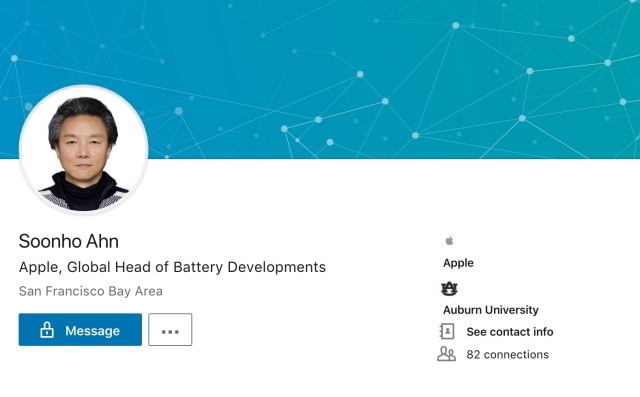 Apple has hired Soonho Ahn, Samsung SDI's former Senior VP of Next Generation Batteries and Materials Innovation, as its Global Head of Battery Developments.