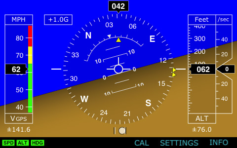 iHUD Features: (Works on iPhone 3G and 3GS)... * Excellent 'Glass Cockpit' colored dynamic graphics featuring MFD data * Highly accurate and sensitive motion visualization using on-board GPS and accelerometer data * Displays graphically: heading, speed, un-accelerated attitude, altitude, vertical speed, slip/skid * Displays digitally: heading, speed, altitude, vertical speed, G-load * GPS accuracy indicator lights and ± value ranges * Weak or no GPS signal generates red colored cross-out of affected visualized data * User settings for various metric and US standard units * User settings for color selection for speed ribbon range (multi-color ribbon) * User setting for compass bug (heading bug) digitally or by moving the heading bug on-screen * Sophisticated accelerometer offset calibration