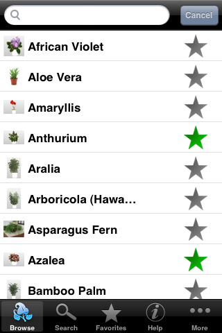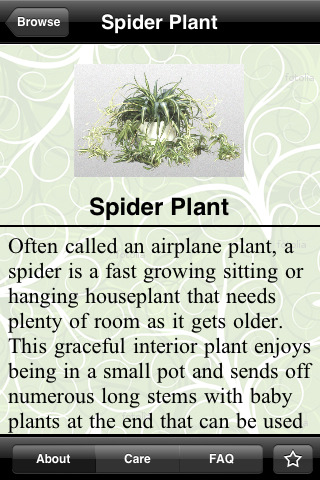 Houseplant 411 features include: * Browse 70 houseplants in alphabetical order * Search for recommended houseplants based on lighting requirements, ease of care, plant usage, suitability for offices, flowering, and those that clean the air. * Create unique lists of your favorite indoor plants for future reference * Get help for any plant question with the "Ask Judy" feature * Find numerous links and articles, tips and tricks for plant care with the push of a few buttons