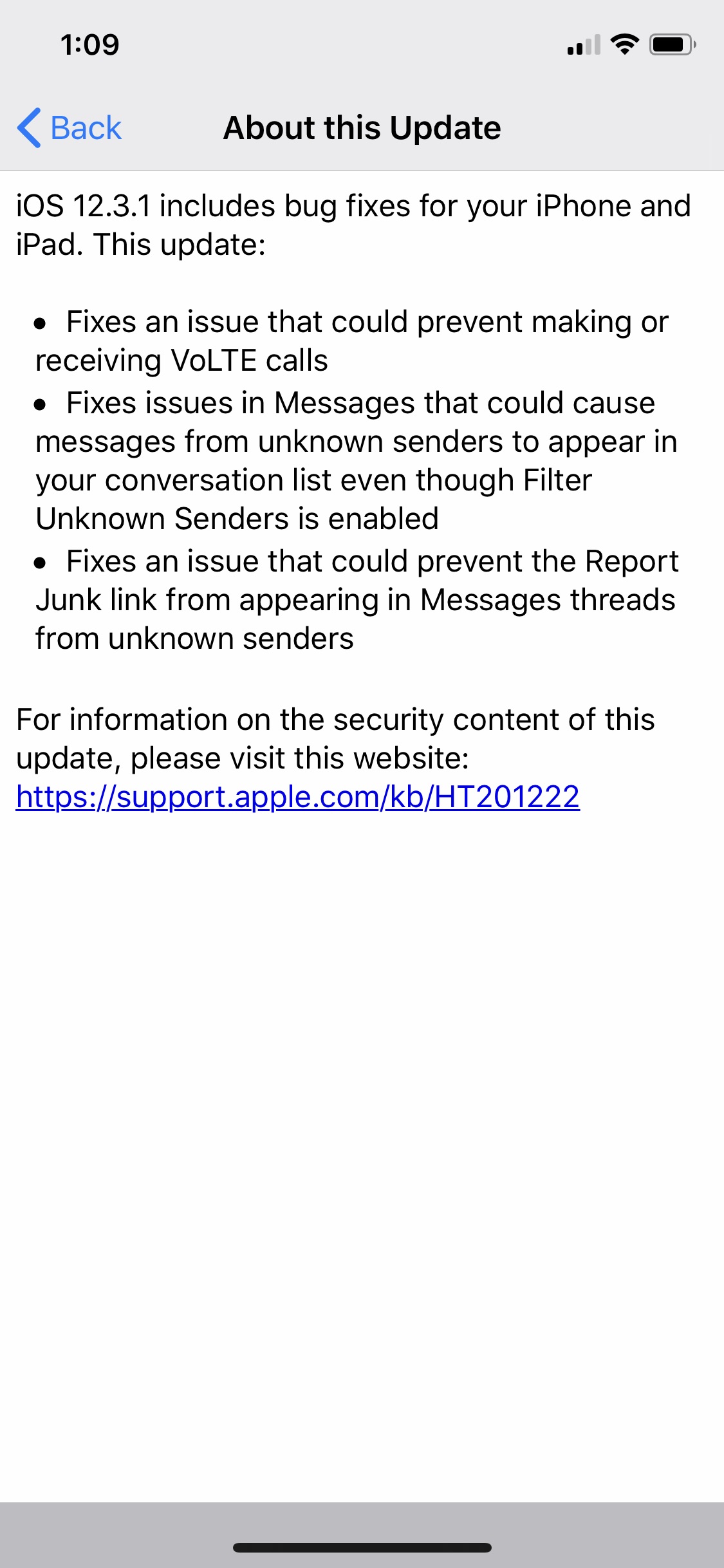 This update: ● Fixes an issue that could prevent making or receiving VoLTE calls ● Fixes issues in Messages that could cause messages from unknown senders to appear in your conversation list even though Filter Unknown Senders is enabled ● Fixes an issue that could prevent the Report Junk link from appearing in Messages threads from unknown senders