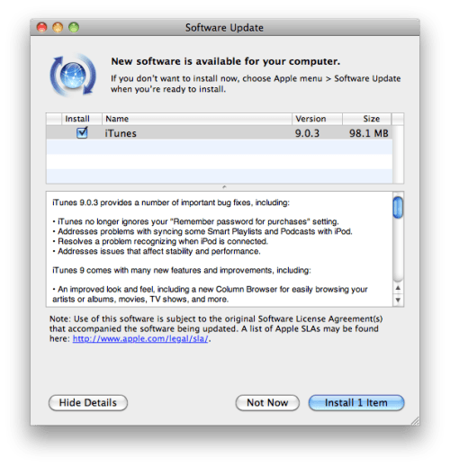 iTunes 9.0.3 provides a number of important bug fixes, including: iTunes no longer ignores your "Remember password for purchases" setting. Addresses problems with syncing some Smart Playlists and Podcasts with iPod. Resolves a problem recognizing when iPod is connected. Addresses issues that affect stability and performance.