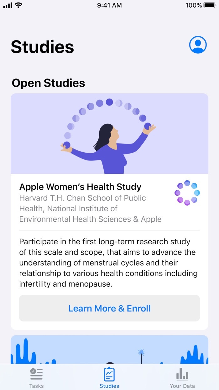 ● Join the Apple Women’s Health Study, conducted in partnership with the Harvard T.H. Chan School of Public Health and National Institue of Health Sciences to help advance the understanding of menstrual cycles and health conditions such as infertility, osteoporosis, and menopause.