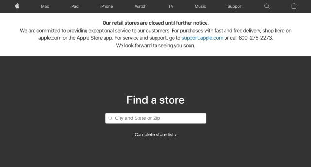 Our retail stores are closed until further notice. We are committed to providing exceptional service to our customers. For purchases with fast and free delivery, shop here on apple.com or the Apple Store app. For service and support, go to support.apple.com or call 800-275-2273. We look forward to seeing you soon.