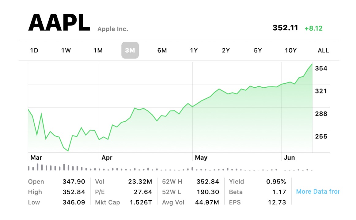 AAPL is currently trading around $352 with about 4.3 billion shares outstanding. That puts its market cap at nearly $1.53 trillion.