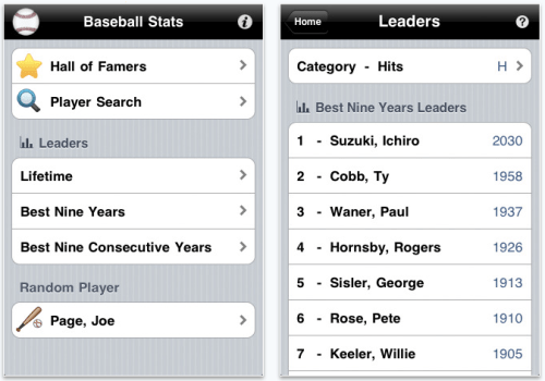 CASH Productions has released its iPhone application Baseball Stats 1.0 in the AppStore. Baseball Stats is an iPhone application that delivers stats for Major League Baseball players in a rather different way. The application displays the statistics for a player's Best Nine Years in Hits, Home Runs, or some other category. It also displays the statistics for a player's Best Nine Consecutive Years span in any of the previously mentioned categories.