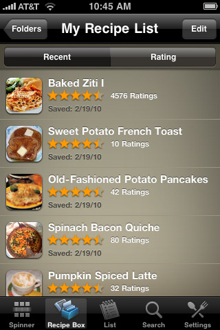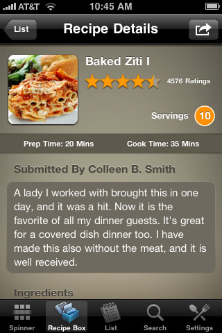 Features: - Browse and save new recipes to your online Recipe Box. - Browse the entire selection of recipes to find your favorites or discover new ones. - Include or exclude up to eight ingredients to narrow your recipe search. - Email recipes to friends and family, or share with bluetooth. - Access your existing shopping lists, create new ones, and even share them. Dinner Spinner Pro is also smart enough to combine the same ingredients from different recipes. - No more ads!