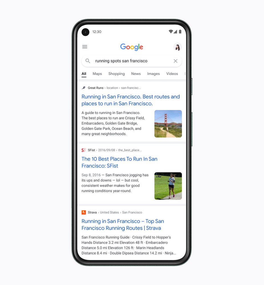 2. Making text easier to read. One way the team did this was by using larger, bolder text, so the human eye can scan and understand Search results faster. “We’re making the result and section titles bigger, as well,” Aileen says. While we’re on the subject of text: The update also includes more of Google’s own font, which already shows up in Android and Gmail, among other Google products. “Bringing consistency to when and how we use fonts in Search was important, too, which also helps people parse information more efficiently,” Aileen explains. Image showing a phone with Google Search pulled up on the screen. The search query is for "running spots sf." 3. Creating more breathing room. “We decided to create a new edge-to-edge results design and to minimize the use of shadows, making it easier to immediately see what you’re looking for,” says Aileen. “The overall effect is that you have more visual space and breathing room for Search results and other content to take center stage.”