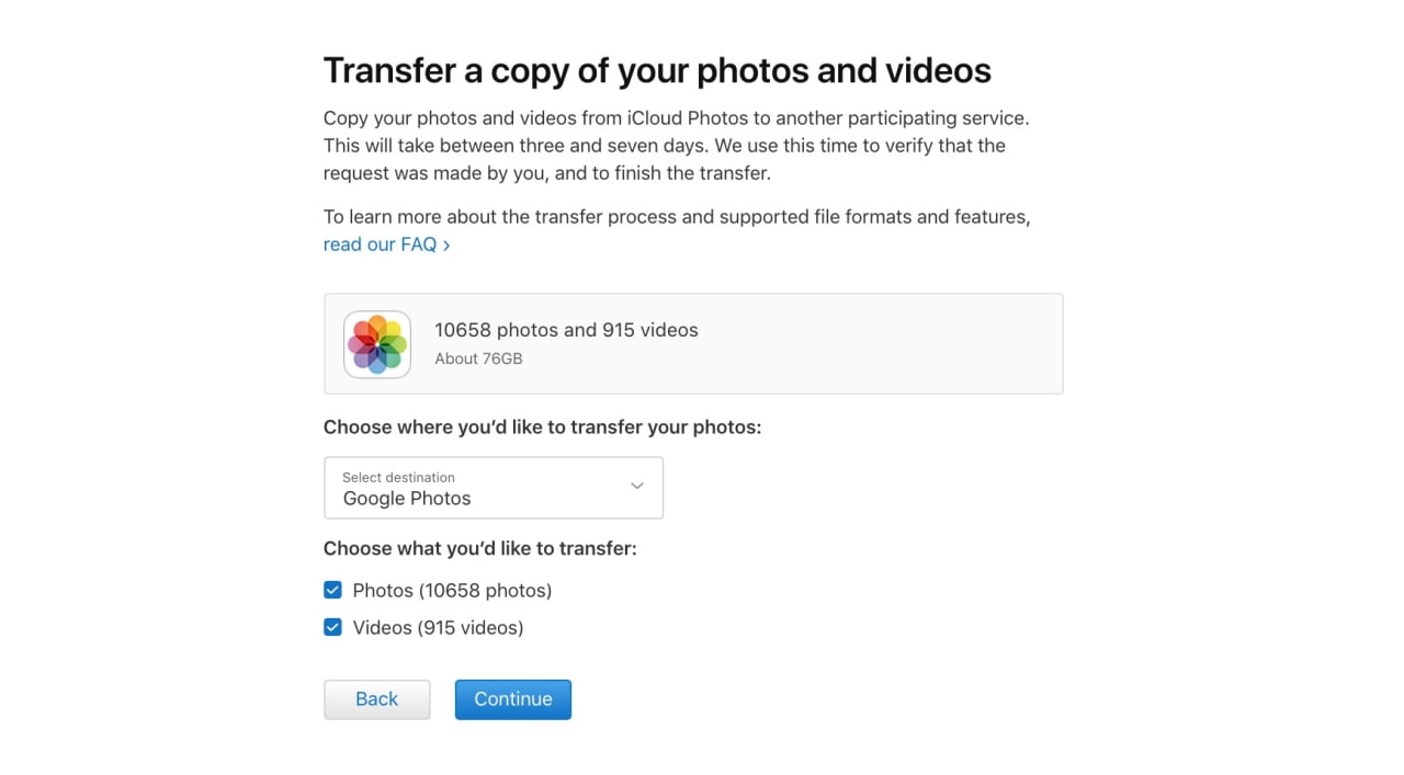 You can request to transfer a copy of photos and videos you store in iCloud Photos to Google Photos. Transferring photos and videos from iCloud Photos doesn’t remove or alter the content you store with Apple, but sends a copy of your content to the other service. The transfer process takes between three and seven days. We use this time to verify that the request was made by you, and to make the transfer. Some data and formats available in iCloud Photos—such as Smart Albums, Live Photos, or some RAW files—may not be available when you transfer your content to another service.