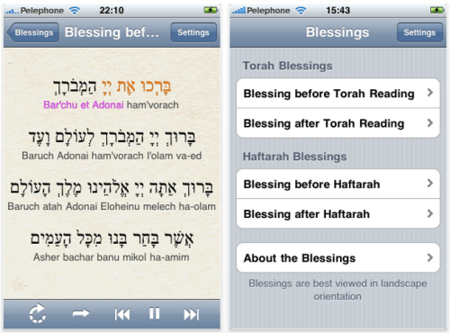 iBless Torah displays the text of the blessings in the original Hebrew and English transliteration on screen, and chants the text, highlighting each word as it is pronounced. Users can pause after each section, tap and listen again, or go forward to the next section. iBless Torah includes the text and audio of the short blessings recited before and after the reading of the Torah, as well as the text and audio of the longer blessings recited before and after the Haftarah, the prophetic reading recited after the Torah portion. The program also includes information about the history and importance of the Torah reading in the synagogue.