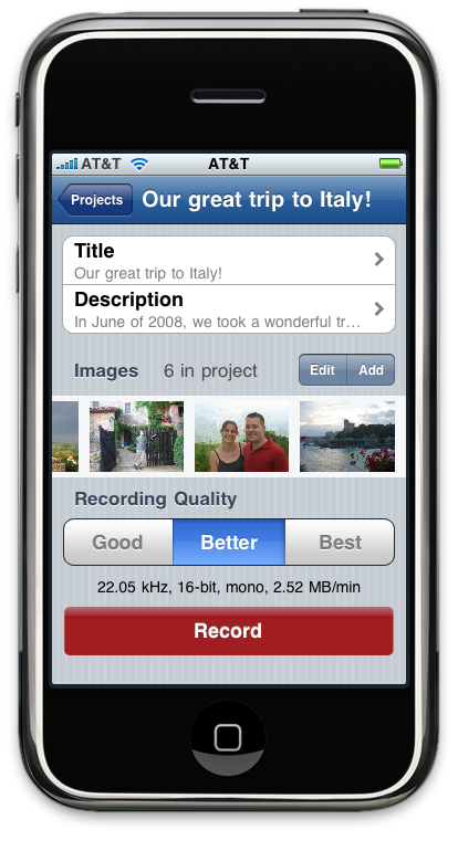 SonicPics makes it easy to use images from the iPhone's photo library or built in camera to make custom slide shows and then record a voiceover narrating the images as you swipe through them. Once you are finished, you can create an enhanced m4v video with your images synchronized to your narration, complete with chapter markers. You can share your recording with your family and friends, or even the world.
