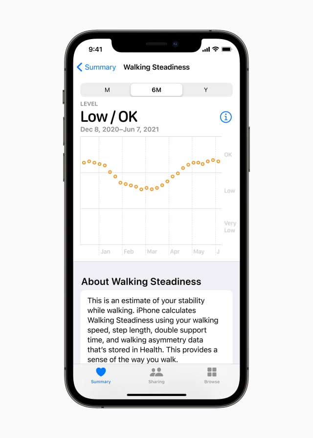 Walking Steadiness More than 37 million people each year require medical attention as a result of a fall, which can often be a tipping point for more serious conditions and a loss of independence.1 Walking Steadiness on iPhone is an industry first, providing insight into fall risk by capturing important mobility data as users walk with their iPhone. Currently, fall risk is assessed by a care provider through a questionnaire and an in-person evaluation. Walking Steadiness offers the added ability to capture everyday movements and surface classifications within the Health app as OK, Low, or Very Low, allowing users to proactively take action to help reduce their risk of falling.
