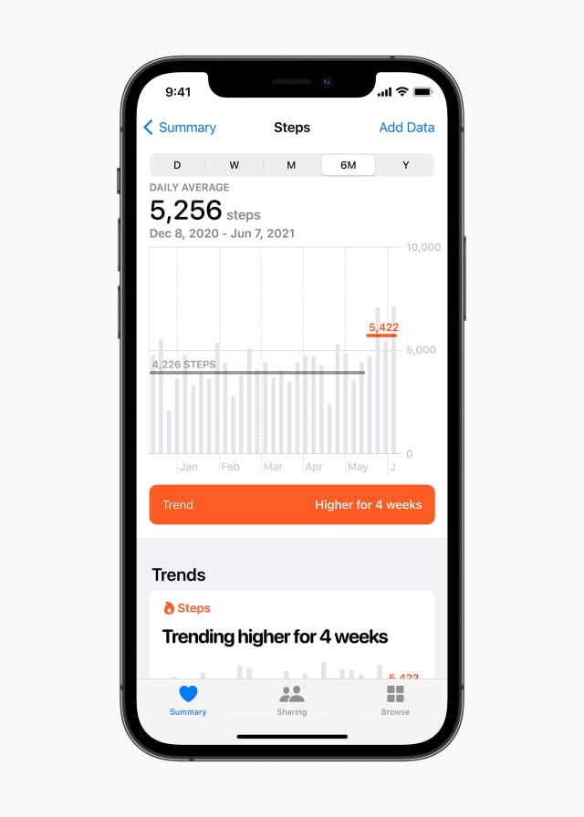 With optional notifications, Trends can highlight long-term changes in health, so a user can celebrate progress toward a goal, or discuss with a doctor or care team.