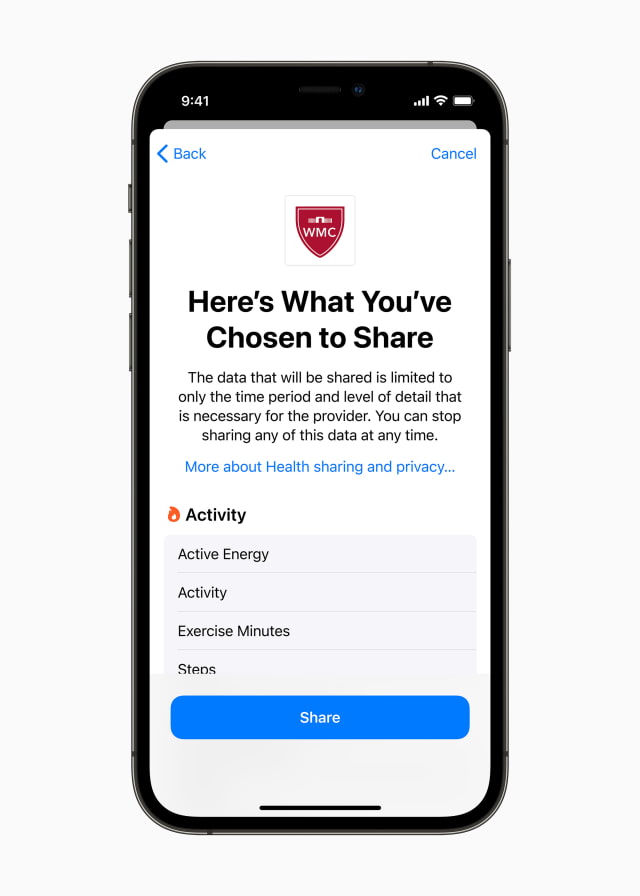 Having meaningful conversations with a doctor about everyday activities during a visit is a key part of managing health, but it can be difficult to remember the details. With user permission, the Health app can keep track of valuable information, helping bridge the gap of what a person experiences between clinic appointments. Now, users in the US can choose to share certain types of health data — like heart rate, detected falls, hours of sleep, or exercise minutes — with their doctor, for more informed conversations. At participating healthcare organizations, a physician can review the Apple Health app data that a user chooses to share directly in the electronic health records system.