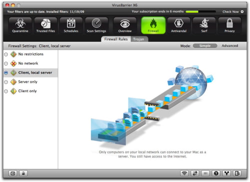 Also available is Internet Security Barrier X6 DP, which includes VirusBarrier X6 and four other Intego programs, ContentBarrier, Personal Backup, Personal Antispam and FileGuard, providing parental control, backup, antispam, confidential document protection features and much more. For Windows protection, Internet Security Barrier X6 DP includes BitDefender Internet Security 2010, which provides protection from viruses, hackers and spam, as well as parental control and firewall protection.