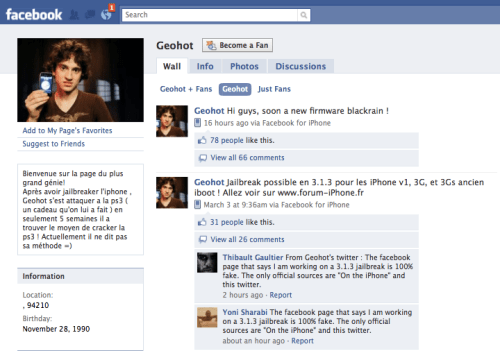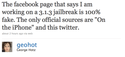 Geohot has tweeted that the Geohot Facebook Page which has announced a BlackRa1n update for 3.1.3 is 100% fake.