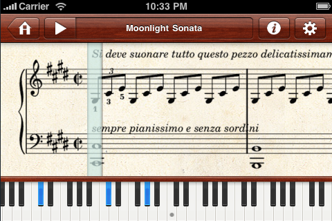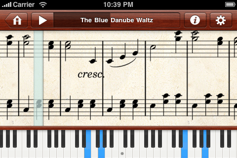 While learning a piece of music may be difficult at its original speed, built into Etude is a music settings panel, which controls the playback speed, auto-scrolling, and showing or hiding the keyboard on-screen. Etude directly integrates with social networking sites Facebook and Twitter, making the music available to all of your friends to listen to.