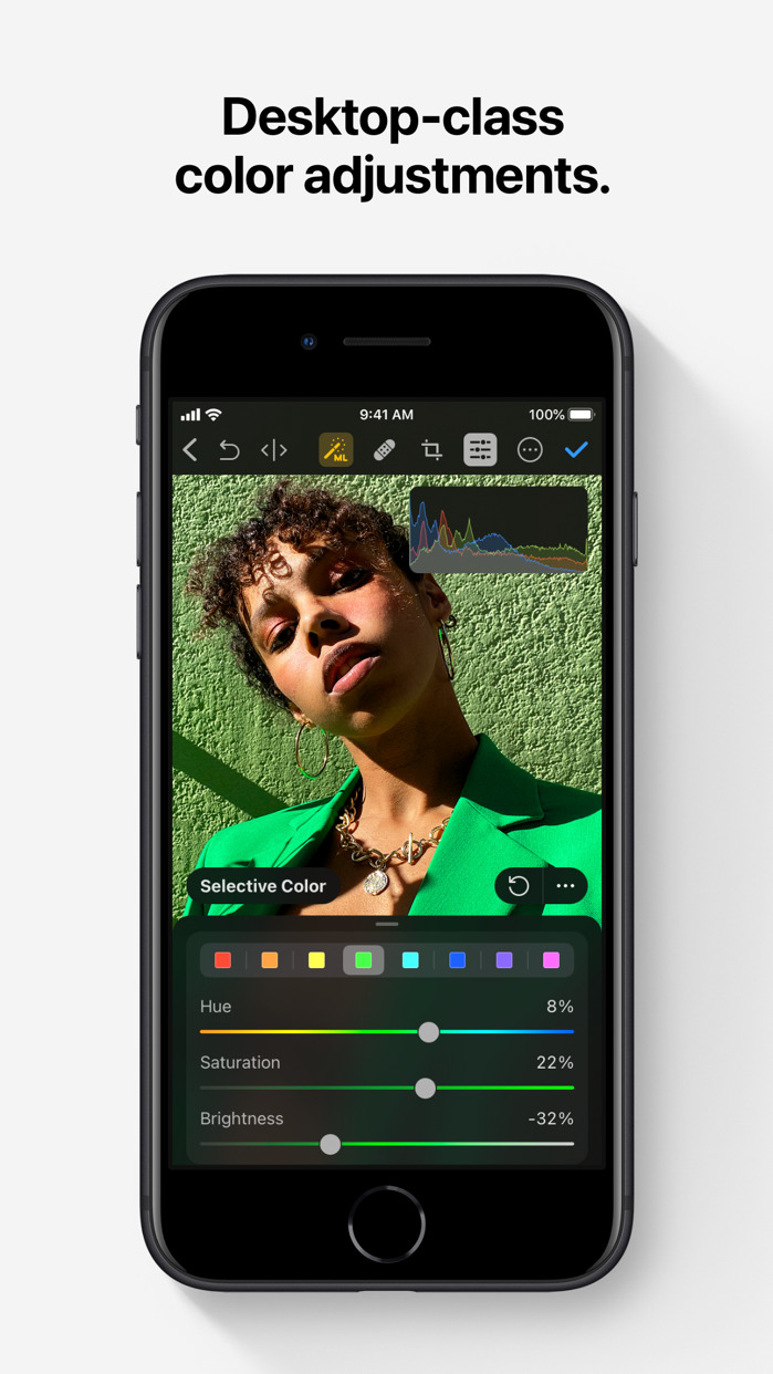 Pixelmator Photo for iPhone • Enjoy the full, desktop-class photo editing experience of Pixelmator Photo on iPhone. • Edit photos using a complete collection of powerful, nondestructive color adjustments designed using advanced image processing techniques. • Make your photos stand out with photographer-designed presets inspired by film photography. • Effortlessly remove unwanted objects using an incredible object removal tool. • Automatically enhance shots using a machine learning algorithm trained on 20 million pro photos. • Magically increase the resolution of photos using AI. • Crop, straighten, and rotate photos with a powerful and easy-to-use Crop tool. • Automatically sync every change you make back to your Photos library. • Easily copy and paste edits between photos or batch edit even hundreds of photos at a time. • Open and edit over 600 RAW image formats, including Apple ProRAW. • Remove camera noise and image compression artifacts with the Core ML-powered Denoise feature. • Copy the look of any photo to another using AI-powered color matching. • Follow all the changes you make in the beautiful live histogram.