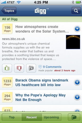Keep up with the latest popular content on the web with Digg's official iPhone app! We want to make it easy to discover interesting content on your phone and to jump into the conversations around that content. You can browse lists of recent news, search for the topics you care about, and save stories to check out later.