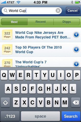 Some highlights... * Browse lists of the top stories in 24 hours, recently popular stories, and upcoming stories with rising interest * Preview any story in a list by clicking the arrow next to each item in the list, which will reveal the story description, source, thumbnail, date, and submitter * Save any story youre interested in to a list for easy access later * View websites in an integrated browser, with options to Digg, bury, save, and share the story in-line * Read through and vote on the comments for any story * Search for any story on Digg and sort results by date, Digg count, or relevance * Easily share stories with your friends via Facebook, Twitter, or email * Best of all, login to link the app to your digg.com account and easily Digg or bury both comments and stories