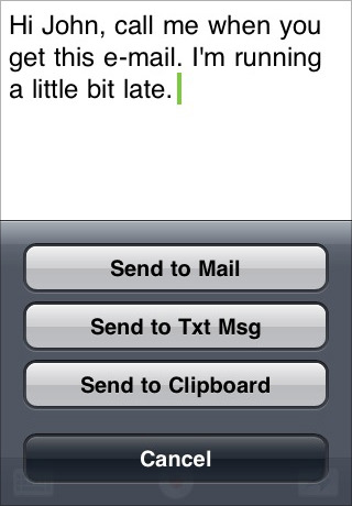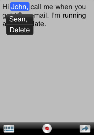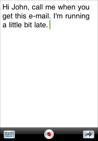 FEATURES Voice-to-text transcriptions that may be sent as SMS, Email, or pasted into any application on your iPhone using the clipboard Convenient editing feature that provides a list of suggested words Voice driven correction interface
