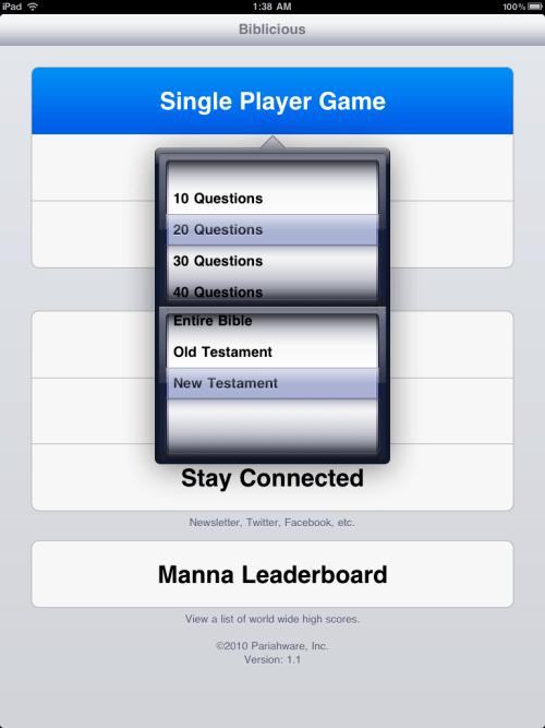 Pariahware has announced Biblicious 1.1, a game for iPad, iPhone and iPod touch. Players can choose from three game modes, a 10 through 50 question game, and whether questions come from the Old or New Testaments, or the entire Bible. After a game mode is chosen, Flip Ant, your game show host, will ask you to choose your game type.
