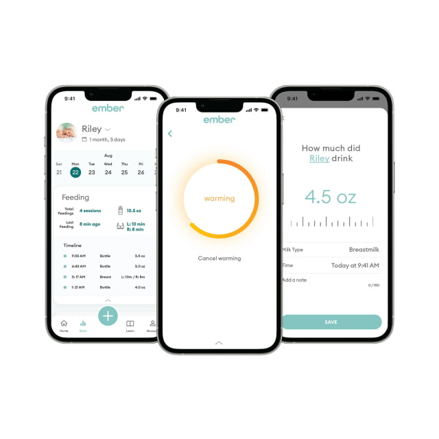 The Ember Baby Bottle System connects to the new Ember Baby app, available on iOS and Android, to warm the bottle remotely for night-time or on-the-go convenience. The app also provides an integrated smart solution to track and monitor feedings as well as baby's growth.