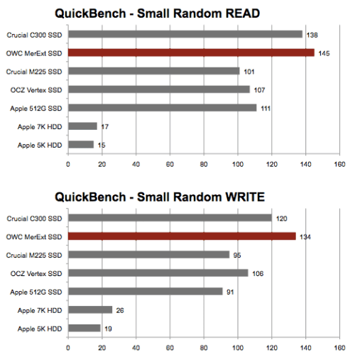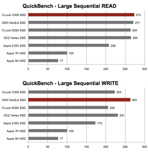 Their results show that although the Apple offered SSD easily outperforms a regular hard drive it comes in last when compared to the other drives tested. However, it is important to note that the other SSDs tested were half the capacity or less.